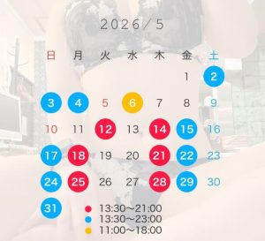 | 4/29(水) | 4/30(木) | 5/1(金) | 5/2(土) | 5/3(日) | 5/4(月) | 5/5(火) |